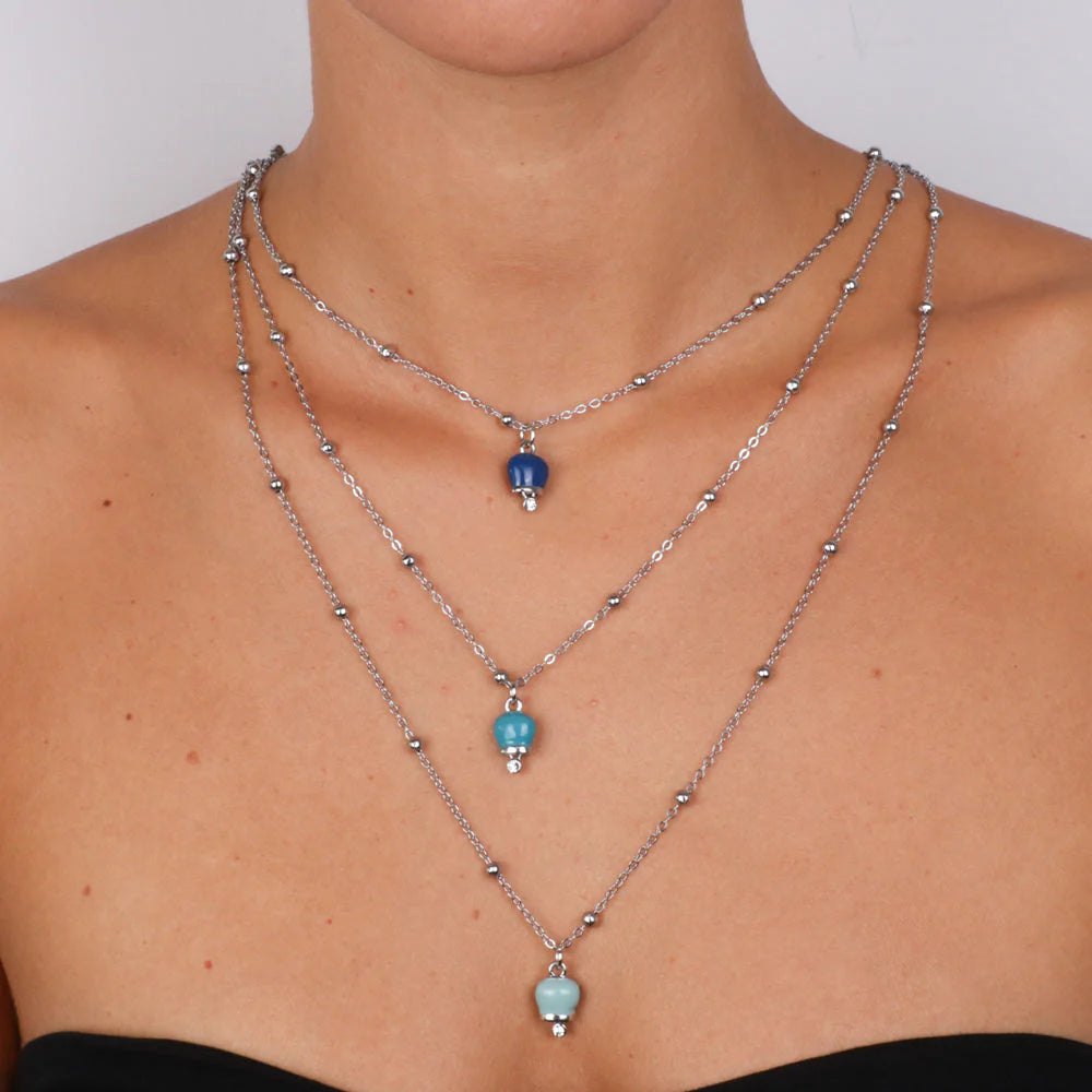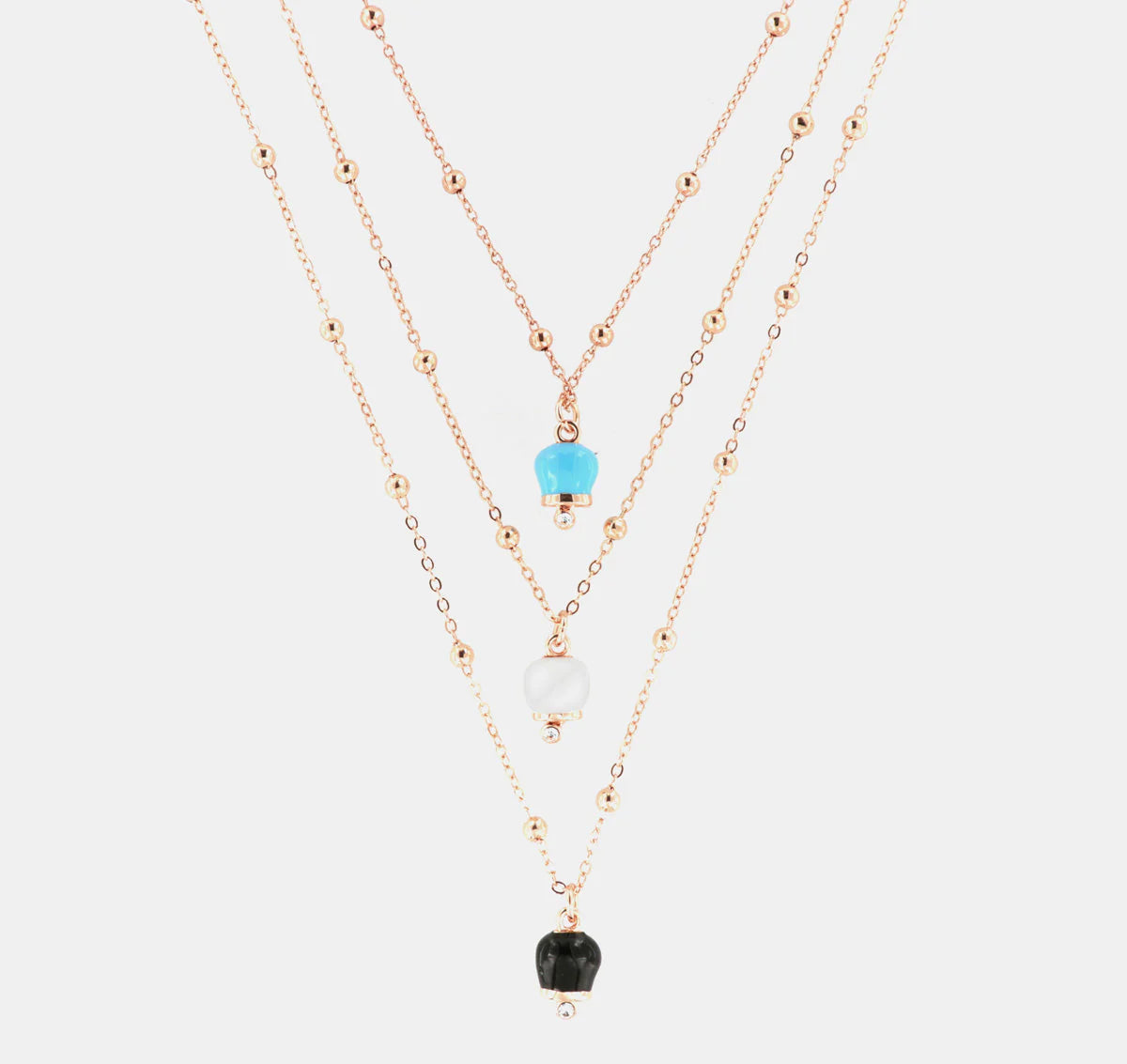 Collana in Metallo a tre fili con campanella nera, bianca e turchese