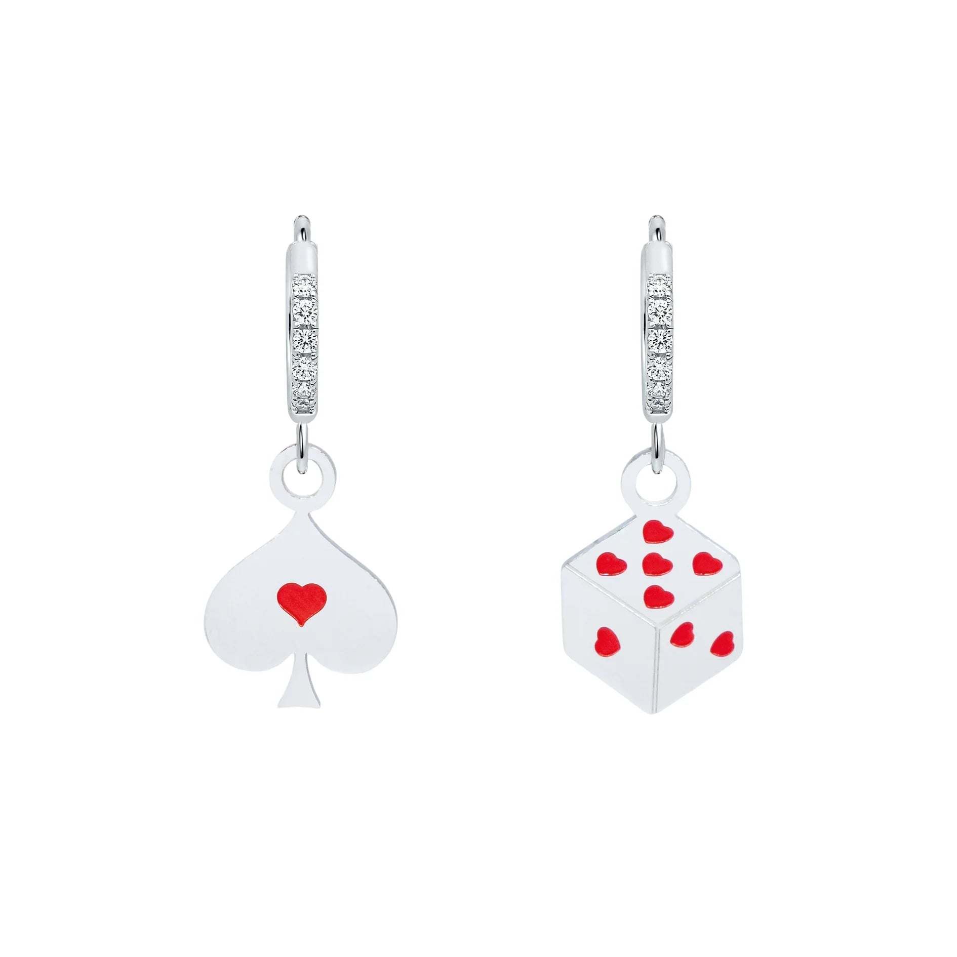 Orecchini a cerchio con cristalli con picca del Cappellaio Matto e dado da gioco pendente. Chiusura a scattino.