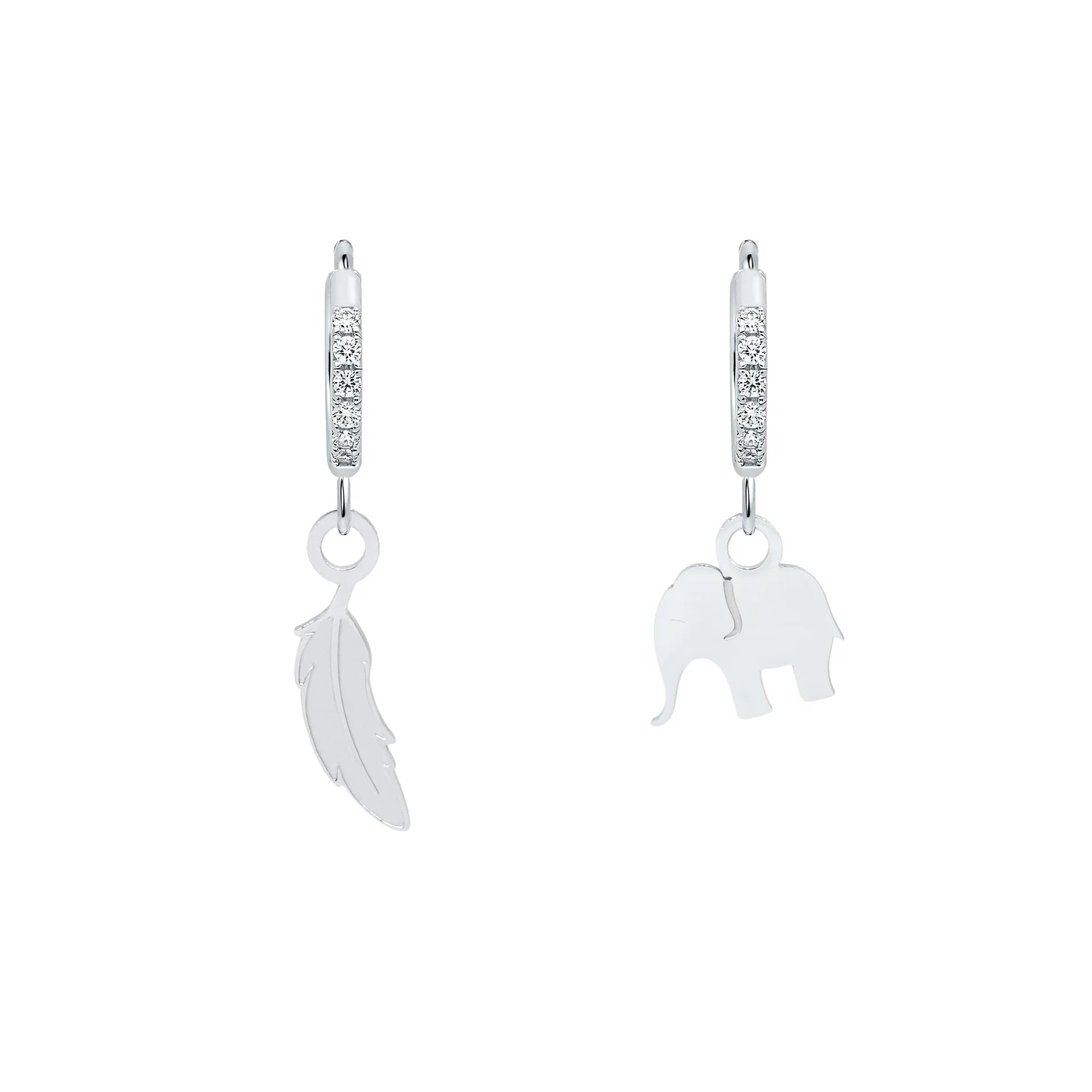 Orecchini a cerchio con cristalli con piccola piuma magica ed elefante pendente. Chiusura a scattino.