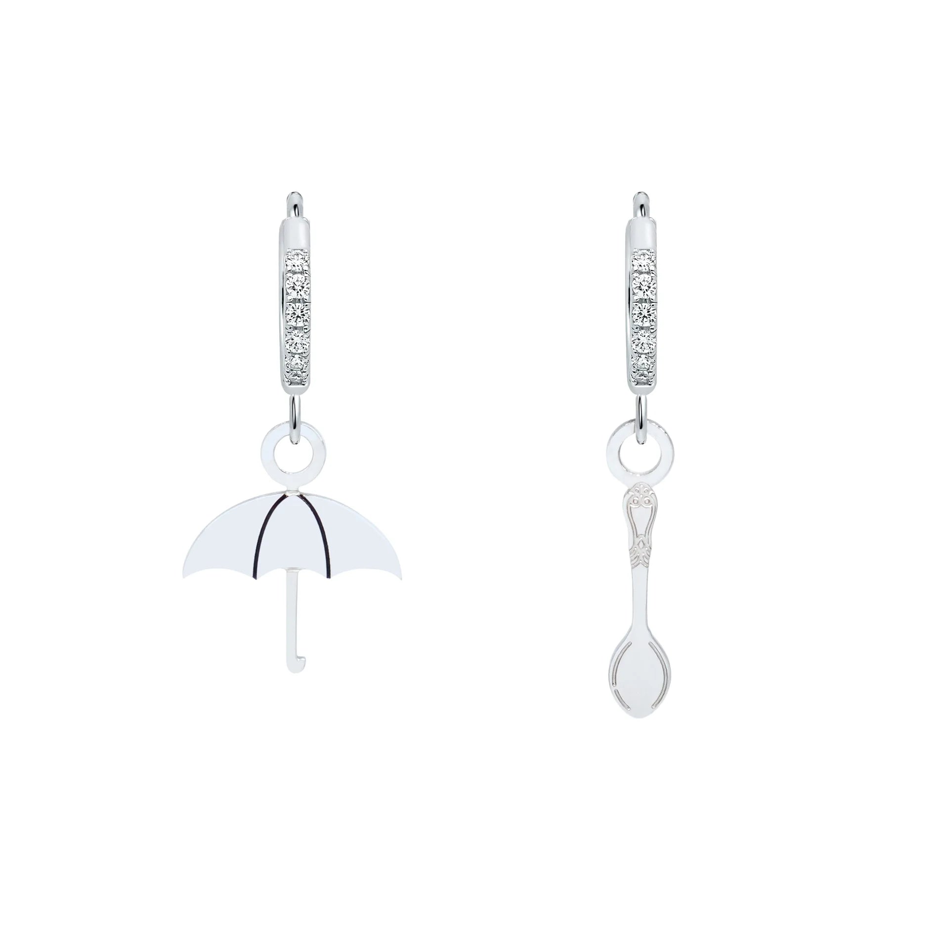 Orecchini a cerchio con cristalli con piccolo ombrello e cucchiaino pendente. Chiusura a scattino.