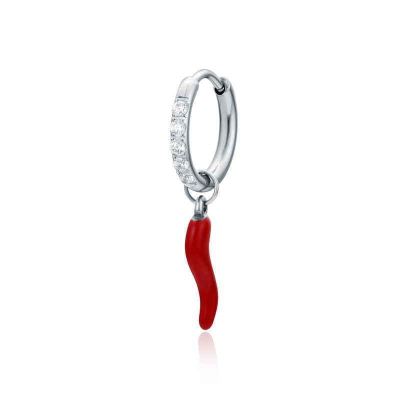 L’orecchino a scattino con cristallini bianchi e pendente a cornetto smaltato rosso portafortuna #BrandGioielli è pensato per chi desidera portare sempre con sé un simbolo di buona fortuna senza rinunciare a stile e femminilità. Viene venduto singolarmente ed è disponibile nelle finiture oro e acciaio, è il regalo perfetto per chi cerca un tocco colorato e di carattere per il proprio stile.